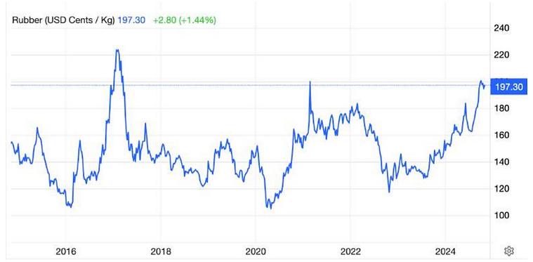Giá cao su tự nhiên đang trong xu hướng tích cực nhất trong 3 năm trở lại đây và trên đường tìm đỉnh 10 năm. Giá bán bình quân mủ cao su trong tháng 5 tăng lên 44 triệu/tấn, tăng 10% so với đầu năm và tăng 30% so với cùng kỳ năm trước.