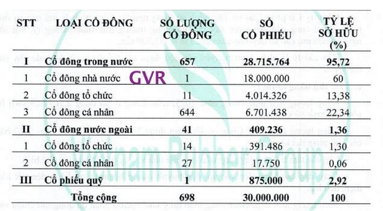 TRC là công ty con của GVR với tỷ lệ sở hữu 60%, còn lại là cổ đông tổ chức và cá nhân khác, freefloat khoảng 25.5% tương đương 11 triệu cổ phiếu.